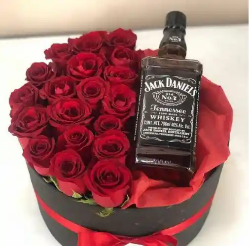 Contenido: 24 Rosas Pasión + Botella Jack Daniels Whiskey 1 Tarjeta Personalizada 1 Domo Decorado Personalizado