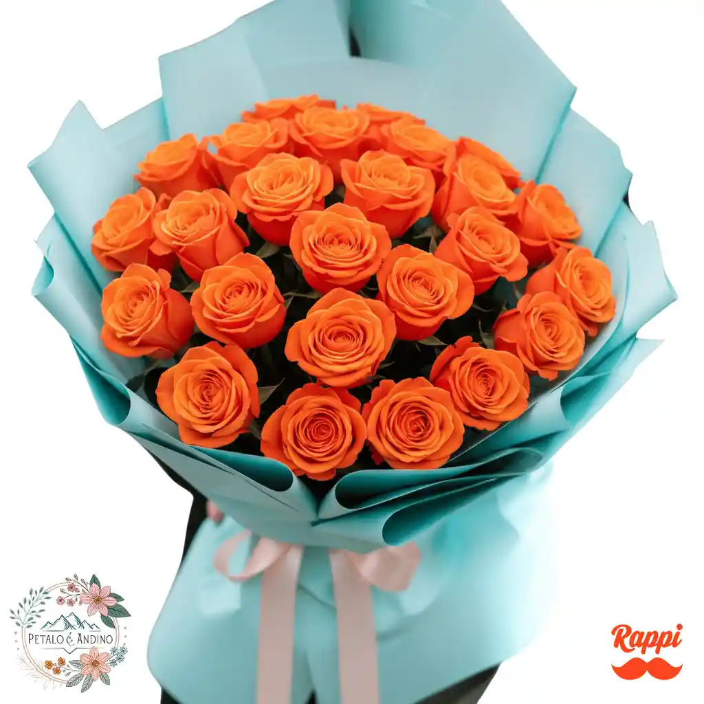 Un radiante bouquet con 24 Rosas Premium de un vibrante color naranja, que simbolizan alegría y entusiasmo, elegantemente envueltas en papel celeste que evoca la frescura del cielo.