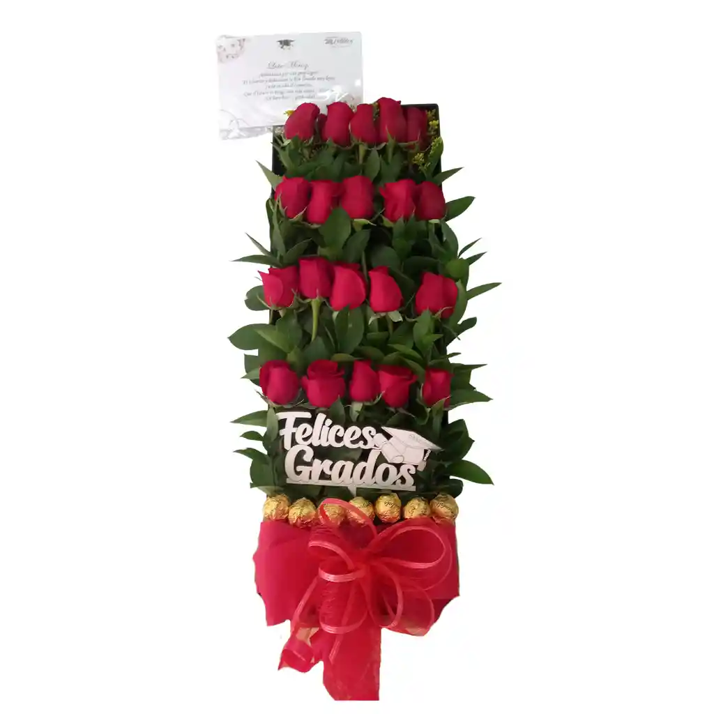 Hermoso arreglo floral de rosas en tapa caja con bombones de chocolate y pin de grados, perfecto para toda ocasión.