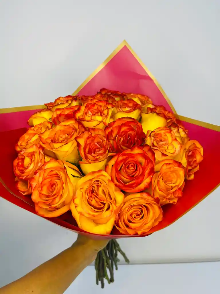 Bouquet de rosas naranjadas frescas, cuidadosamente arregladas para transmitir energía, entusiasmo y alegría en cada pétalo.