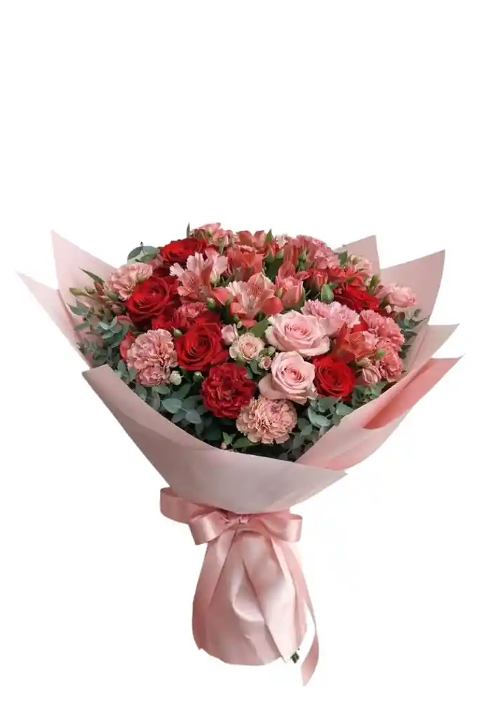 Ramo floral con 8 unidades de rosas rojas, 8 unidades de rosas rosadas, 8 unidades de claveles rosados, y 8 tallos de astromelias envuelto en papel coreano