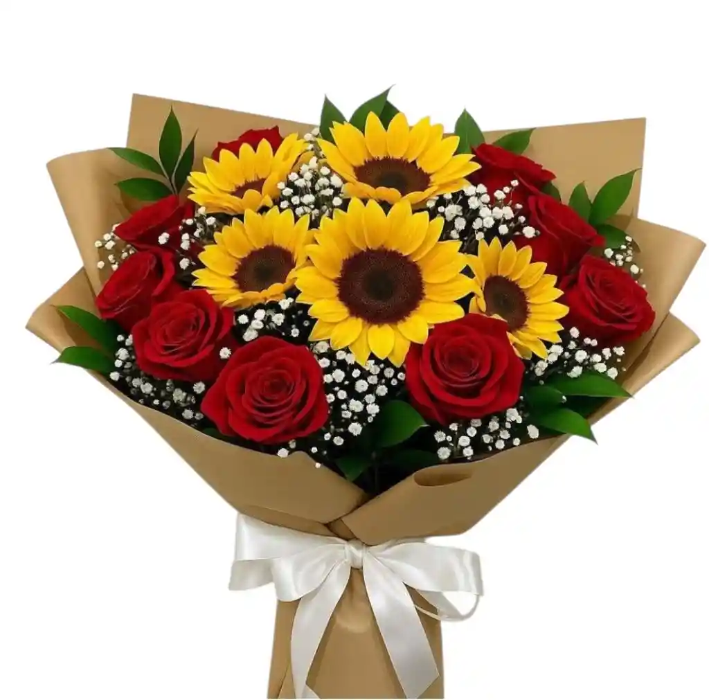Ramo floral con 12 unidades de rosas rojas y 5 unidades de girasoles con follajes envuelto en papel kraft.