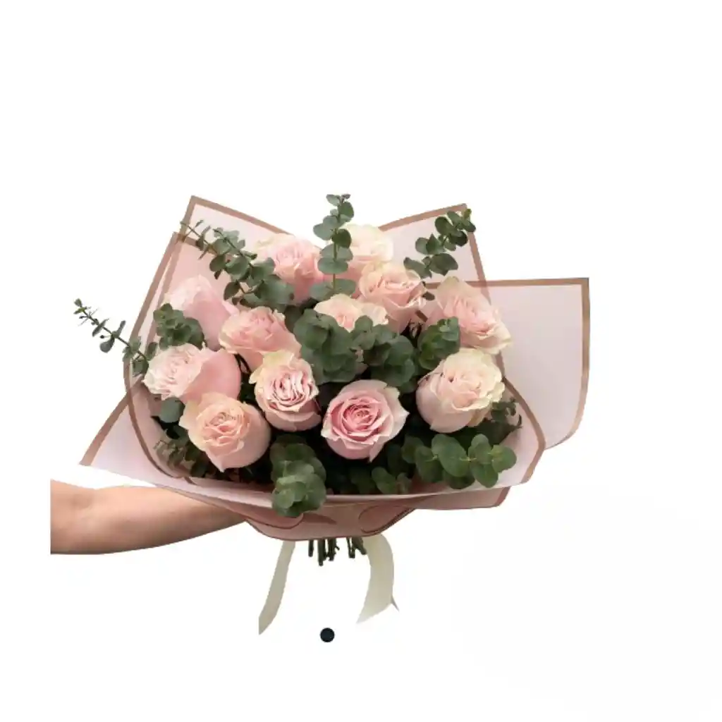 24 rosas rosadas, eucalipto en bouquet incluye decoracion y mensaje personalizado