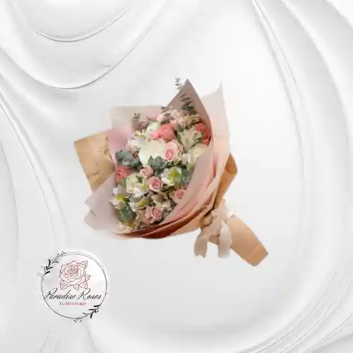 Ramo para obsequiar el día de las madres o para tu amor contiene: 8 rosas rosadas, 3 rosas blancas, astromelia blanca, mas follaje y decoración, tarjeta personalizada escríbelo en el chat.