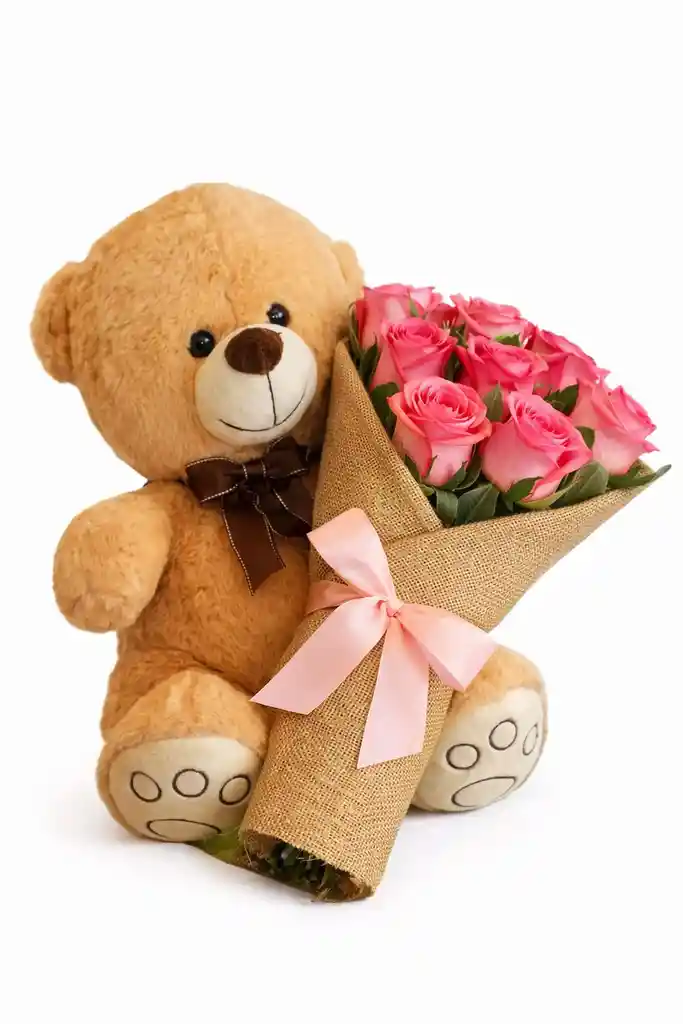 Ramo floral de 8 unidades de rosas rosadas y peluche mediano