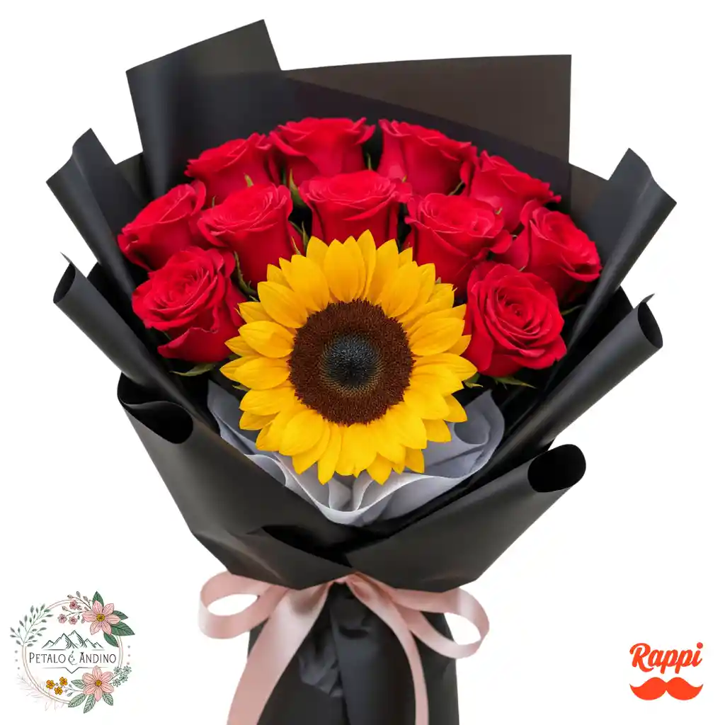 Hermoso ramo con doce rosas rojas y un girasol, cuidadosamente envuelto en papel coreano. El color del papel varía según la disponibilidad. Un detalle perfecto para cualquier ocasión.