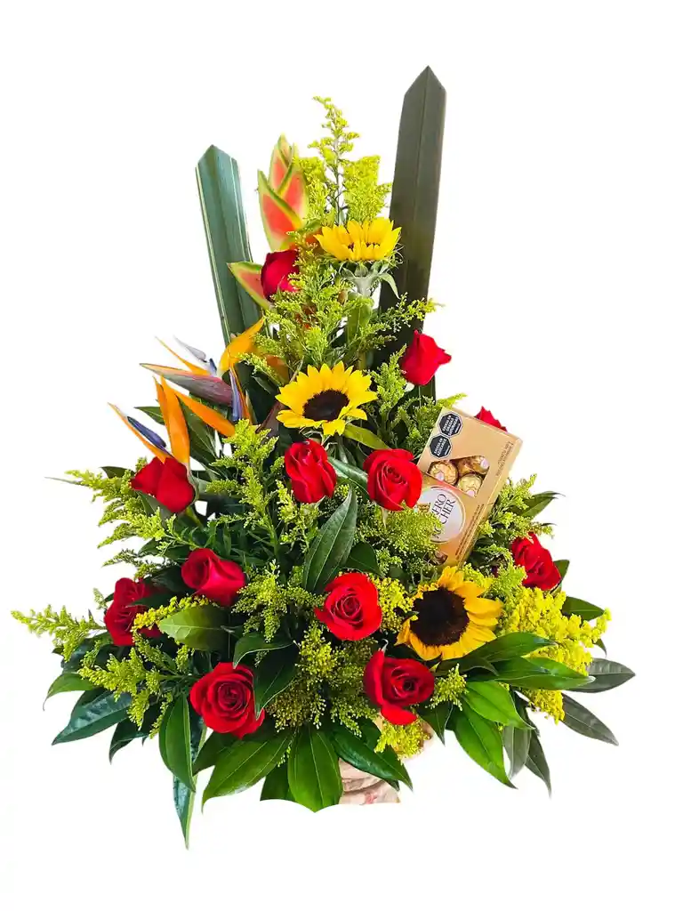 Base de madera compuesto por 12 rosas rojas y 3 girasoles, acompañado de heliconias, aves del paraíso, follaje verde y un toque dulce de Ferrero Rocher x8. Una combinación exótica, elegante y romántica, perfecta para sorprender con un detalle inolvidable y lleno de personalidad.