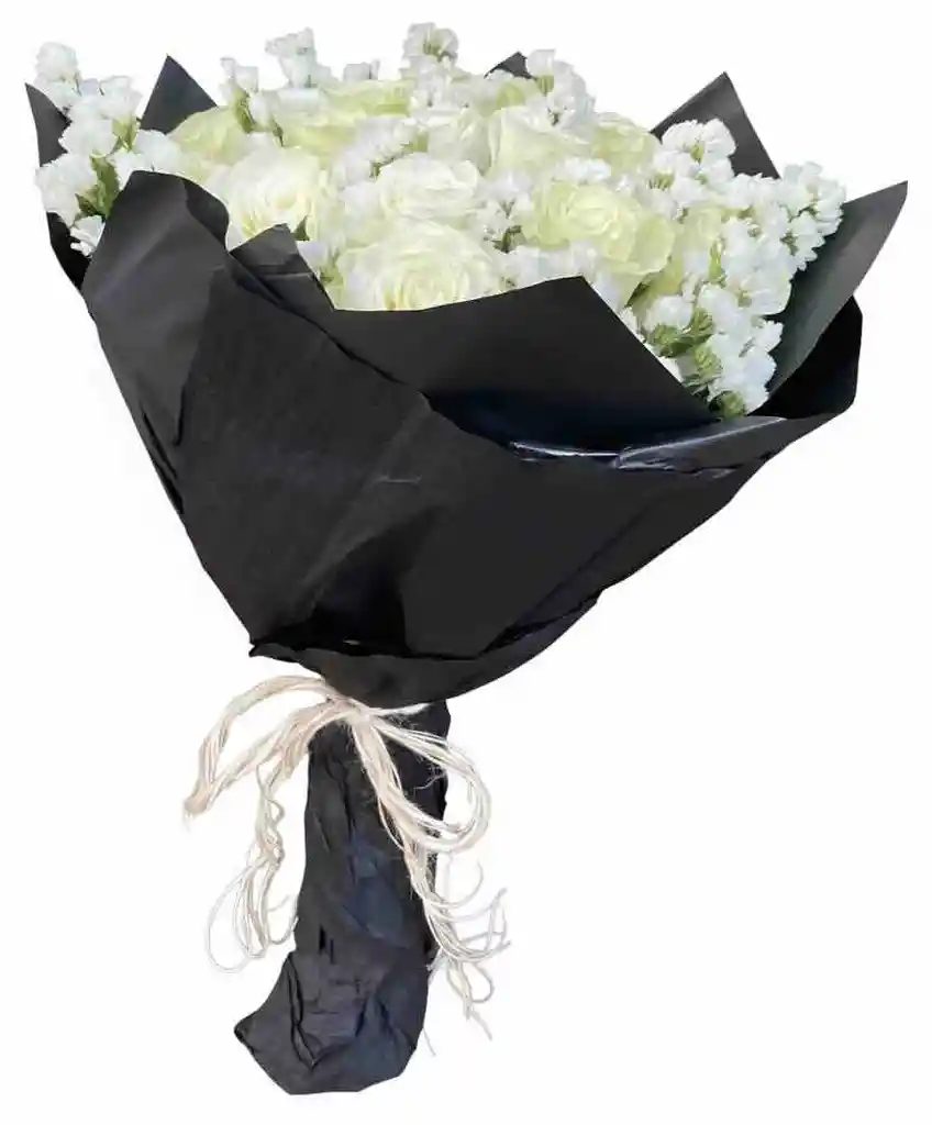 Bouquet de rosas blancas con follajes blancos, Este producto incluye una tarjeta personalizada para que escribas tus palabras especiales. Incluye 12 rosas, follajes blancos, papel y moño para regalar.