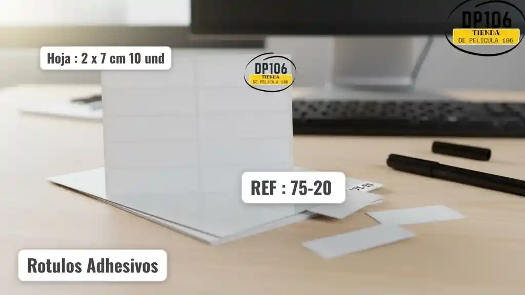 1 hoja con 10 rotulos adhesivos de medidas 2 cm de ancho x 7.5 cm de largo