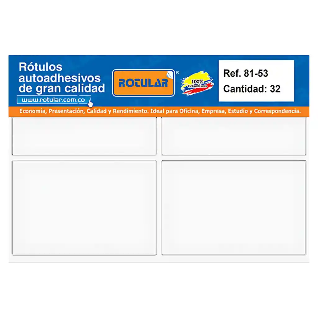Rotulo Adhesivo rectangular blanco 81 mm x 53 mm. Paquete x 32 unidades. Marca Rotular 100% colombiano.