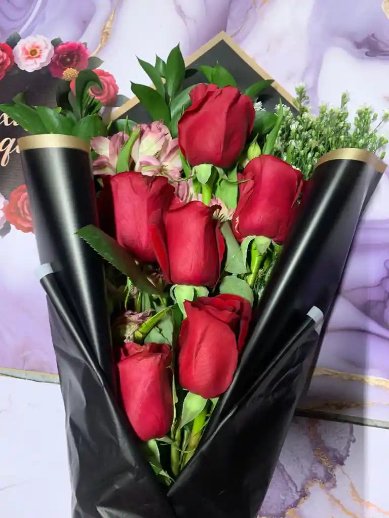 Ramo compuesto de 6 rosas rojas 4 rusgus o follaje 6 astromelias rosadas y 4 aster blancos envuelto en papel coreano de bordes dorados y un delicado moño de color blanco y rosado el cual aporta elegancia ideal para regalar en cualquier ocacion