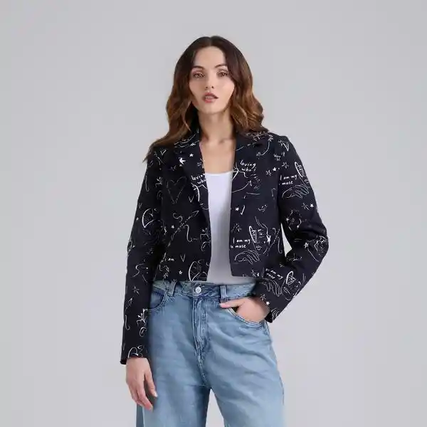 Blazer corto negro estampado, con cuello y solapa clásica y manga larga. Cierre frontal con botón. Composición: 97.5% algodón, 2.5% spandex. La modelo mide 1,70 m y usa talla S. Cuidados especiales: Leer la etiqueta de cuidados antes de lavar.
