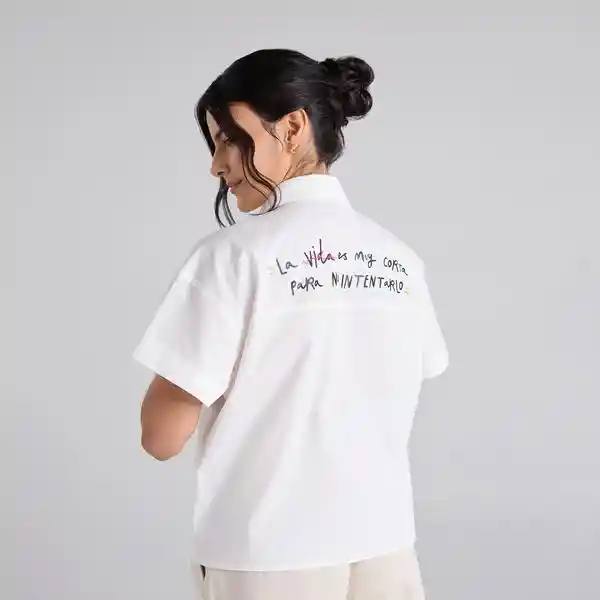 Camisa corta en tono marfil con estampado. Presenta cuello clásico estructurado, manga corta, botonadura central y detalles estampados en el bolsillo delantero y la almilla. Composición: 97% algodón, 3% spandex. La modelo mide 1.60 m y usa talla S. Cuidados especiales: Leer la etiqueta de cuidados antes de lavar.