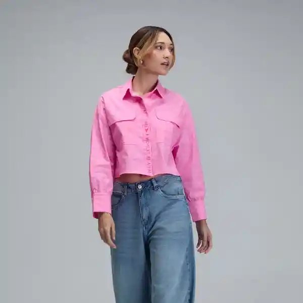 Camisa rosada corta de cuello clásico estructurado. Manga larga con puño y cierre de botón. Botonadura central oculta intervenida con arte gráfico. Presenta dos bolsillos frontales tipo parche con tapa. Composición: 97% algodón, 3% spandex. La modelo mide 1,69 m y usa talla XS. Cuidados especiales: Leer la etiqueta de cuidados antes de lavar.