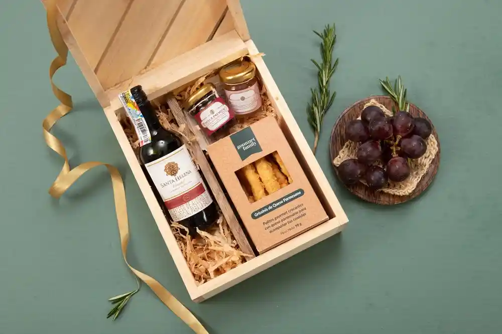 Piba de vino tinto (187 ml) acompañada de unos grissinis con queso parmesano (90g aprox) para untar con dos confituras, una de vino tinto y otra de vino rosado (30 ml cada una)