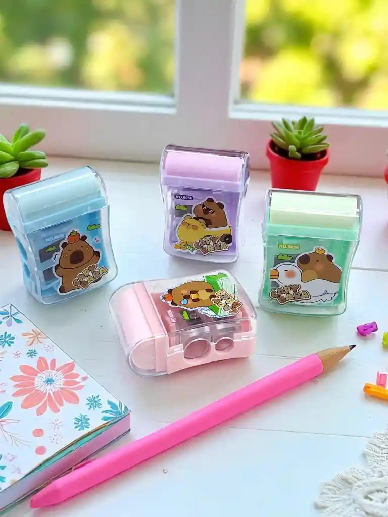 Sacapuntas con Borrador 2 en 1 diseño Capybara, practico y funcional para el daa a dia escolar u oficina. Cuenta con doble orificio para lapices estandar y gruesos, cuchillas resistentes que garantizan un afilado preciso y uniforme, y deposito transparente que permite ver cuando vaciarlo facilmente sin ensuciar. Incluye borrador integrado, ideal para corregir al instante sin necesidad de llevar accesorios adicionales. Su diseño compacto, ligero y con divertidos colores pastel lo convierte en el complemento perfecto para cartucheras infantiles, regalos escolares o uso diario en casa y oficina.