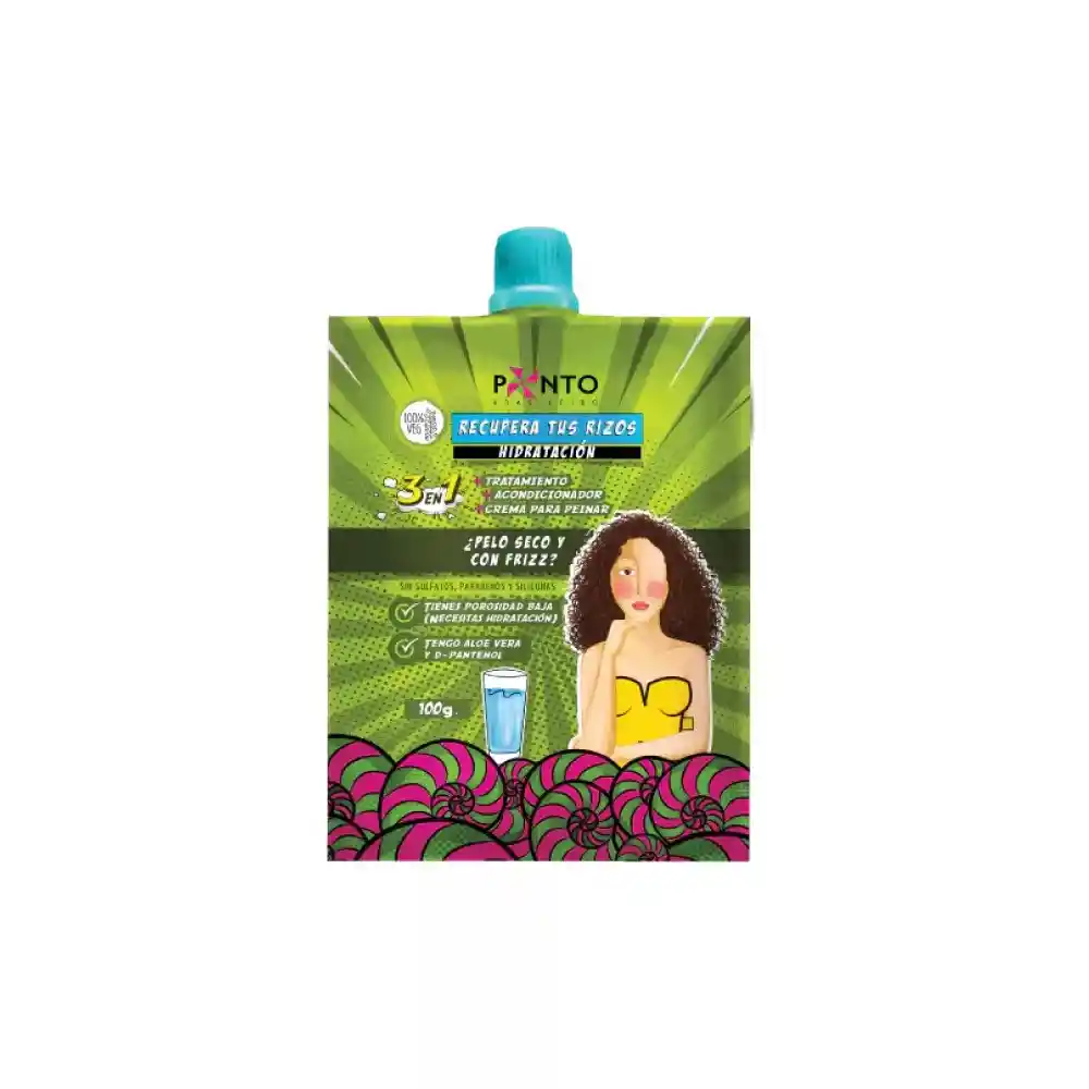 PONTO Hidratación 3 en 1 Sachet es una mascarilla capilar 3 en 1 se puede usar como tratamiento, acondicionador y crema para peinar. Tiene aloe vera y D-pantenol para hidratar tu cabello. Fórmula 100% vegana, sin parabenos, sulfatos y siliconas. Modos de uso: Tratamiento: Aplicar de medios a puntas, dejar actuar 20 minutos y enjuagar con abundante agua. Procede con tu rutina de definición. Acondicionador: Aplicar de medios a puntas, desenredar con un cepillo suave o con los dedos, dejar actuar 3 minutos y enjuagar con abundante agua. Crema para peinar: Aplicar por secciones, mechón por mechón, utiliza tu técnica de definición favorita y deja secar al aire libre o con difusor.