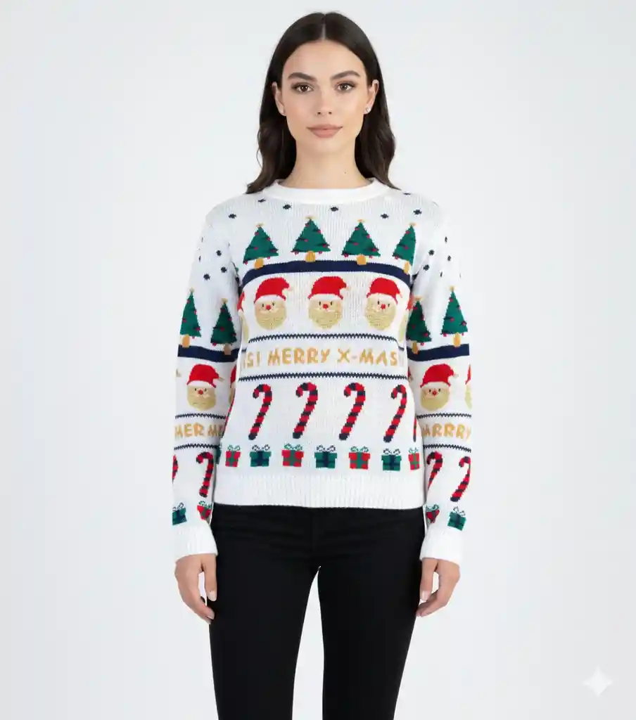 - Saco cuello redondo de Navidad con figuras geométricas. - Los feos suéteres NUNCA van a pasar de moda. - Son unisex, sirven para mujer y hombre. - Material: 100% Acrílico - El modelo usa talla Única y mide 1.60. Talla Única cubre las tallas SML XL -Unisex (para hombre y mujer)