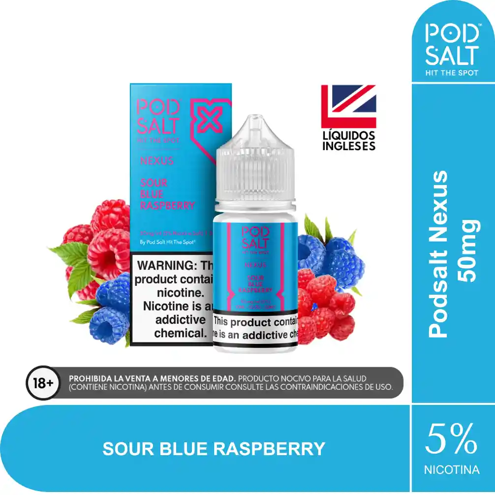 Sal de Nicotina sabor Sou Blue Raspberry 5% concentración de Nicotina. Marca Podsalt. Volumen de líquido: 30 ml. Prohibida la venta a menores de edad. Producto nocivo para la salud que contiene nicotina, sustancia altamente adictiva. Antes de consumir consulte las indicaciones y contraindicaciones de uso.