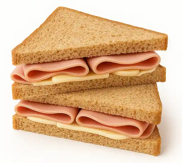 Sandwich de pan integral relleno mayonesa ligera, de 2 lonjas de jamon pietran ( 5.8 gramos de proteína cada lonja) y queso mozzarella...