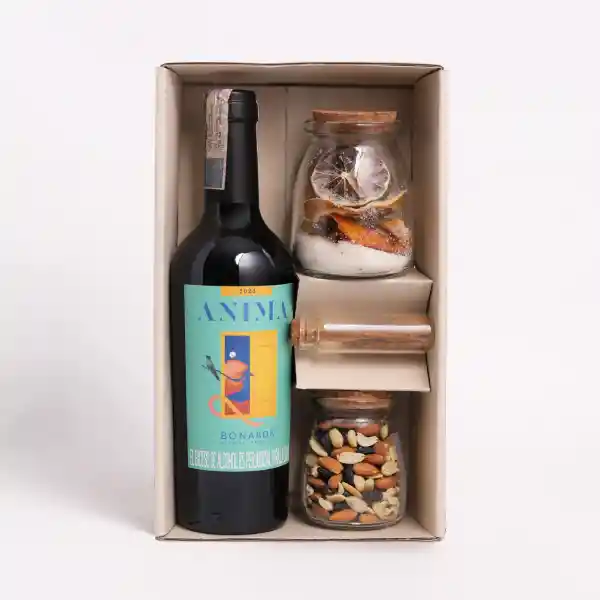 Incluye media botella de vino tinto anima, mezcla lista de especias para sangria, trail mix clasico y canela stick