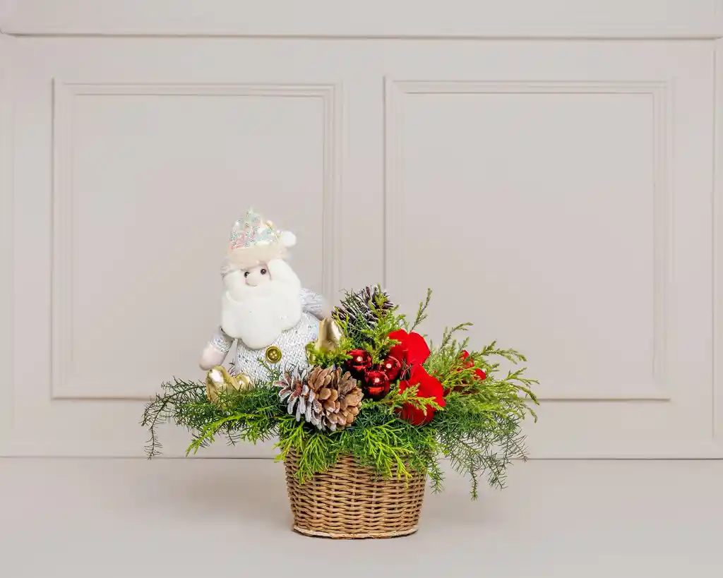 Es un arreglo navideño encantador que combina rosas rojas, pino fresco, piñas nevadas y un tierno Santa blanco, en una hermosa cesta tejida. Un diseño cálido, natural y festivo, ideal para decorar tu hogar o dar un regalo especial en Navidad. Incluye tarjeta personalizada y cuidados del arreglo floral.