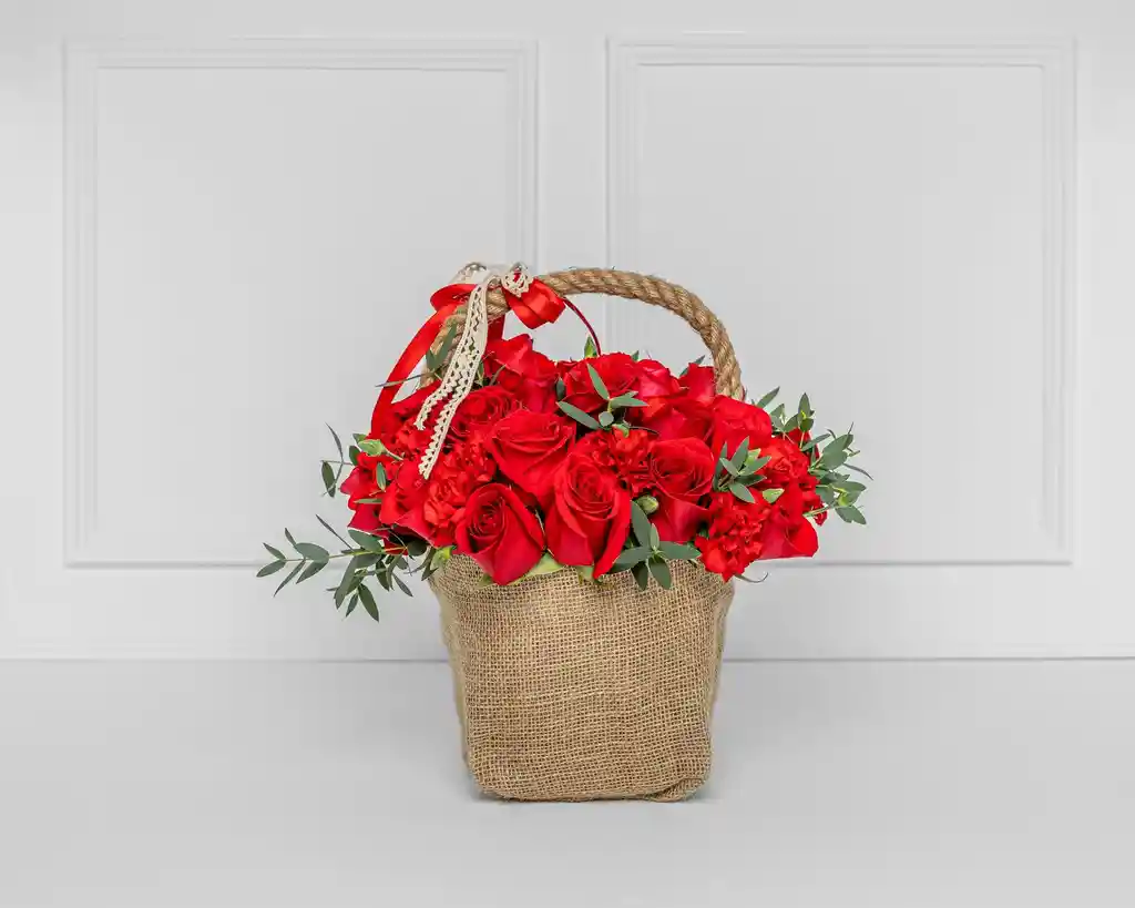 Canasta en fibra natural con rosas rojas y follajes de temporada, diseño clásico y atemporal, ideal para sorprender. Incluye tarjeta con mensaje personalizado e instrucciones de cuidado para mantener la frescura de las flores.
