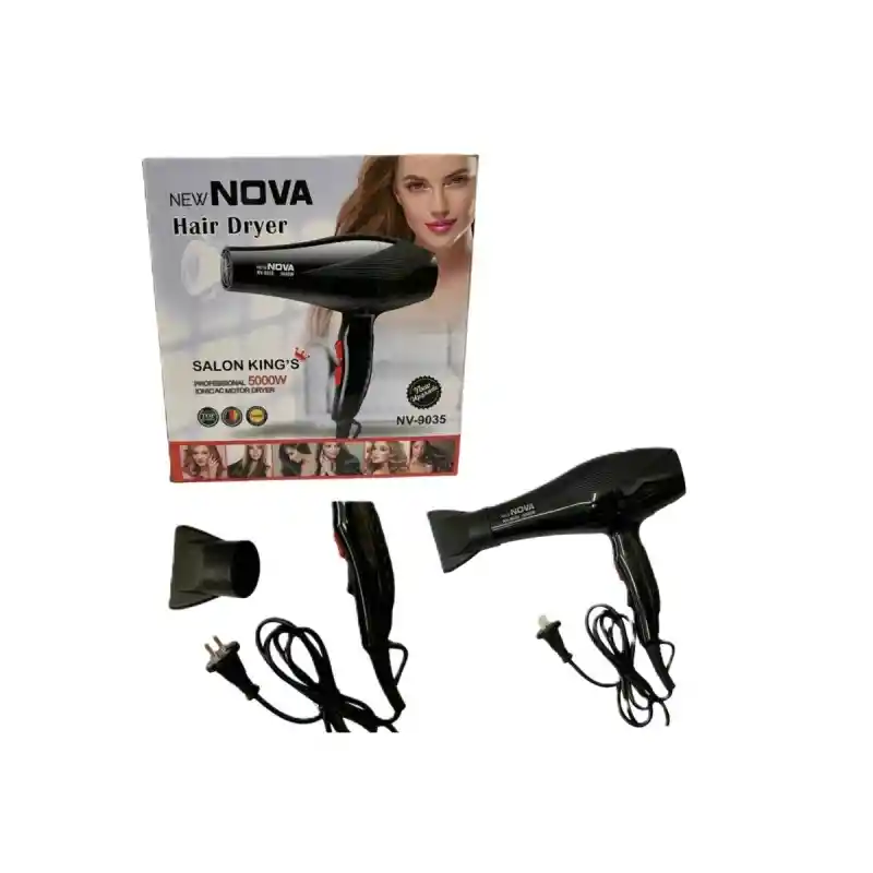Secador Para Cabello NOVA Hair Dryer NV-9035 El secador de cabello NOVA Hair Dryer NV-9035 es la herramienta ideal para quienes buscan resultados de salón sin salir de casa. Con su potente motor de 1000W y su tecnología iónica, este secador te permite secar tu cabello de forma rápida y eficiente, sin dañarlo ni resecarlo. Especificaciones : Potente motor de 1000W: Proporciona un flujo de aire constante y potente para un secado rápido y uniforme. Tecnología iónica: Ayuda a sellar la cutícula del cabello, reduciendo el frizz y dejando tu cabello más suave, brillante y manejable. 2 velocidades y 3 niveles de calor: Te permiten adaptar el secador a tu tipo de cabello y al estilo que deseas lograr. Diseño ergonómico y ligero: Facilita su uso y manejo, incluso durante largos periodos de tiempo. Boquilla concentradora: Dirige el flujo de aire a una zona específica, ideal para alisar o dar forma a tu cabello. Cable de 1.8 metros: Te brinda mayor libertad de movimiento.