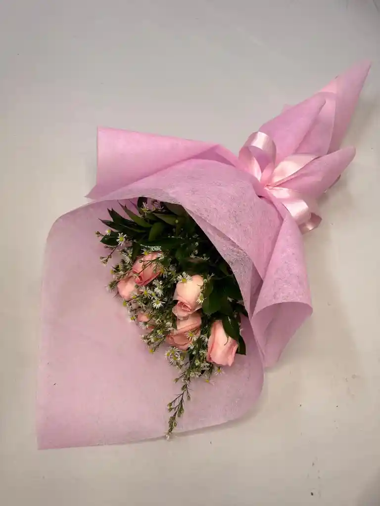 Seis rosas rosadas organizadas con rusco y eucalipto