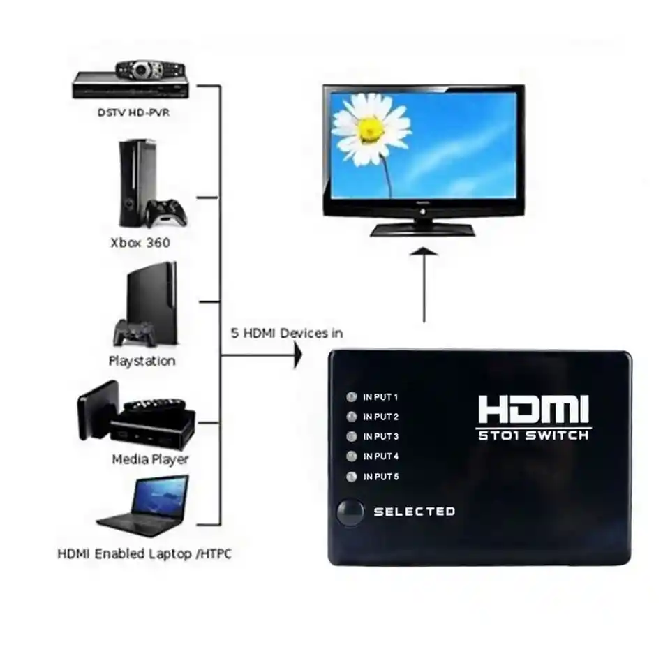 Selector HDMI, ideal para tu TV conectado a varios dispositivos de salida HDMI ( Blu-Ray , DVD , Portatil , etc ) , este dispositivo te permite multiplicar por 5 las entradas HDMI conectados al tiempo y solo debes seleccionar el dispositivo que deseas usar sin tener que desconectar ninguno de tus dispositivos, cuenta con control remoto.