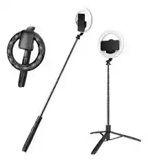 Aro de luz LED con trípode ajustable y soporte para celular, ideal para fotografía, video, transmisiones en vivo y videollamadas. Incluye control para regular la intensidad y el tono de la luz, proporcionando iluminación uniforme y profesional para creadores de contenido, maquillaje o uso en redes sociales.