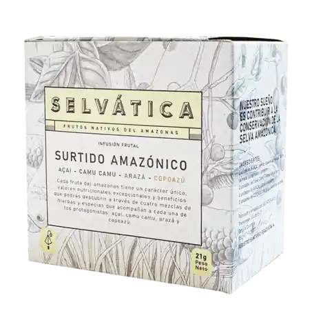 La Infusión Selvática Surtido (21g) es una selección exótica que combina frutas silvestres de la Amazonía con hierbas de alta calidad, creando una experiencia única y nutritiva. Cada infusión está diseñada para resaltar los sabores naturales y los beneficios de las superfrutas amazónicas, ofreciendo una bebida saludable y deliciosa para cualquier momento del día. Características Contenido: 21g (8 bolsitas de infusión). Sabor: Mezcla de frutas amazónicas y hierbas, con un perfil exótico y refrescante. Beneficios: Rico en antioxidantes, sin gluten, sin cafeína y libre de alérgenos. Uso: Ideal para disfrutar caliente o frío, según la preferencia. Origen: Inspirado en la riqueza natural de la Amazonía.