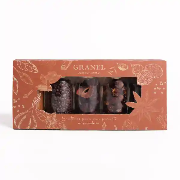 Incluye: panela especiada, infusion frutos rojos, nibs de cacao, uchuva deshidratada y mango recubierto de chocolate