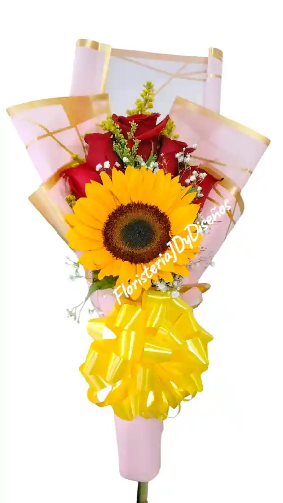 LINDO DETALLE FLORAL CON ROSAS, GIRASOL Y FOLLAJES, CON SU ENVOLTURA EN PAPEL COREANO Y MOÑO EN CINTA DE PAPEL