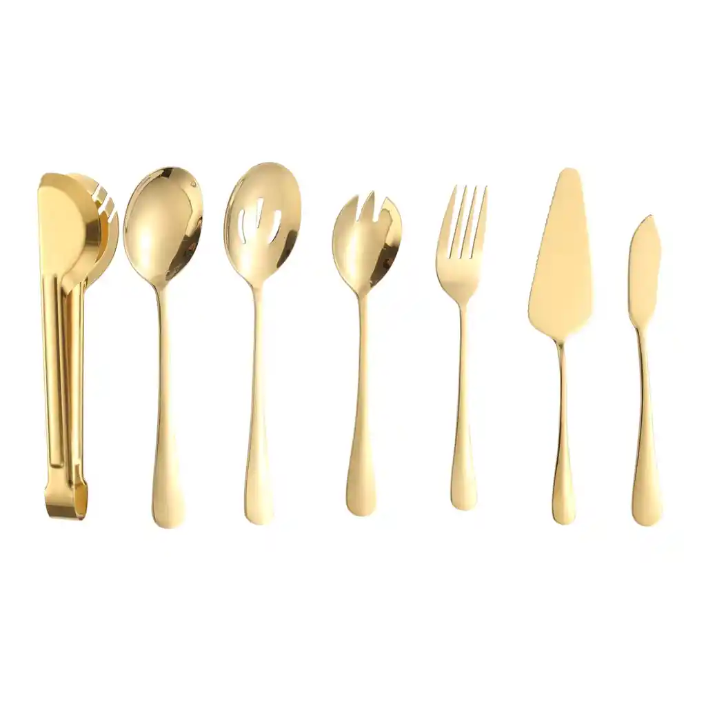 Elegante set de cubiertos de acero inoxidable diseñado para ofrecer durabilidad, resistencia y un acabado pulido que aporta sofisticación a cualquier mesa. Ideal para reuniones familiares, celebraciones o el uso diario, este juego incluye utensilios esenciales como cuchara, tenedor, cuchillo, pala para torta y pinzas de servir. Su material de alta calidad evita la corrosión y mantiene el brillo con el paso del tiempo. Perfecto para quienes buscan combinar funcionalidad y estilo en su cocina.