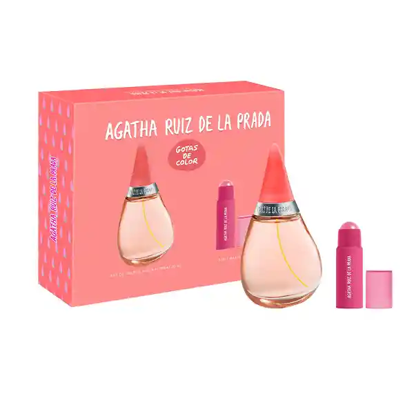 Gotas de Color de Agatha Ruiz de la Prada es la celebración de los placeres mas sencillos de esta vida, un cocktail fresco de felicidad, di versión y frescura que te invita a vivir intensamente cada momento. Este set celebra la feminidad, la alegría y la espontaneidad, con un perfume vibrante y un toque de color para labios y mejillas. Contiene: Fragancia Gotas de Color EDT 100ml - Lip & Cheek Stick. Un set que despierta la alegría y el buen humor en cada aplicación.