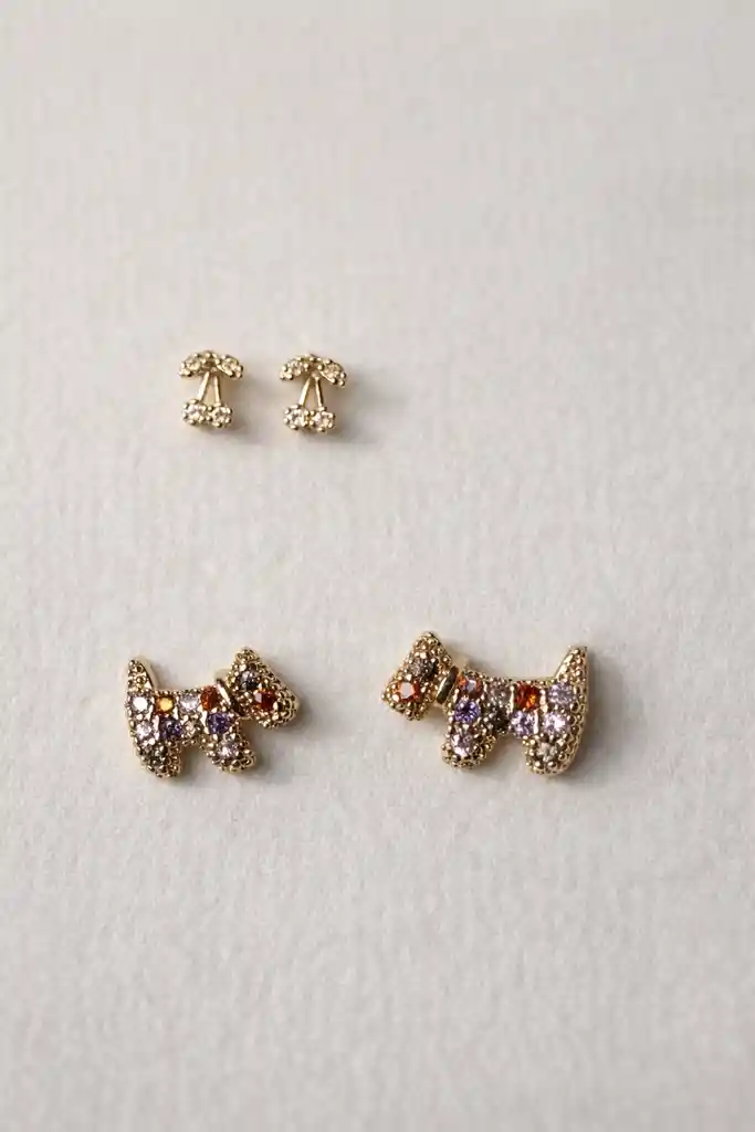 Set Alegria contiene 2 toptos , un par en forma de perritos y otros en firma de mini cerezas , material cover gold , detalles en piedritas de colores y blancas