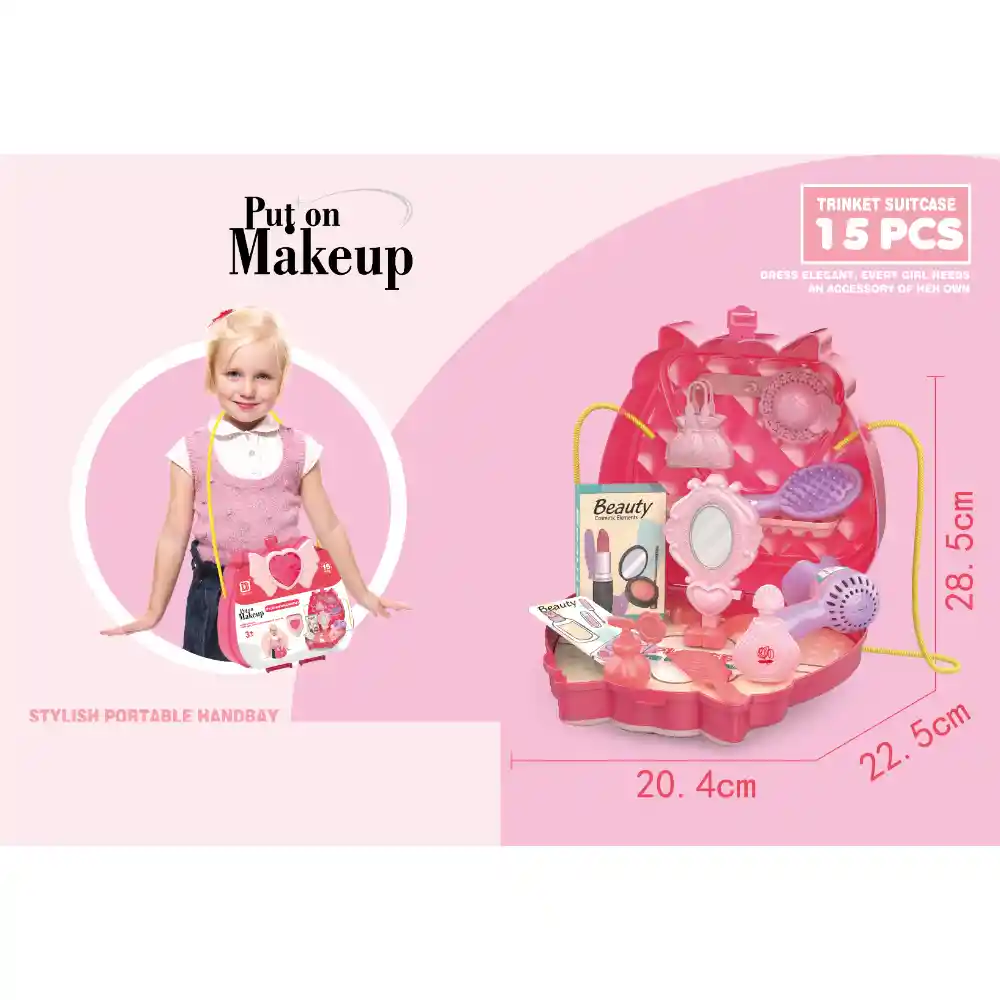 NOMBRE: SET BELLEZA BEAUTY 15 PIEZAS BOLSO DESCRIPCION: Espectacular Set de Belleza con Bolso ideal para que las niñas pasen horas interminables de diversión recreando fantásticas historias de salón de belleza. Este kit de belleza es una gran manera de animar el juego creativo y desarrollo de las habilidades motoras y de imaginación, comunicación y expresión. Incluye imitación de 15 accesorios de belleza. - Dimensiones del producto empacado: 20,4X22,5X28,5 centímetros - Disponibilidad permanente - Despachos a nivel nacional - Tiempo de entrega aproximado 3 a 4 días hábiles contados a partir del día hábil siguiente al pedido. La plataforma te dará un tiempo de entrega mas preciso al momento de concretar la compra. Estamos atentos a resolver cualquier inquietud que tengas después de revisar las fotos y descripción del producto. JUGUETELANDIA más de 30 años ofreciendo diversión. Fabricante: ZE MING TOYS FACTORY Importador: Plasticos Asociados SA Recomendaciones: Requiere de la supervisión directa de un adulto, puede contener partes pequeñas, riesgo de asfixia o ahogamiento, no destinar este juguete para menores por debajo de la edad establecida en la etiqueta. Edad mínima sugerida: 3 años Lote: Dato variable. Se puede verificar en el sticker que trae el producto físico. Fecha de fabricación: Dato variable. Se puede verificar en el sticker que trae el producto físico.