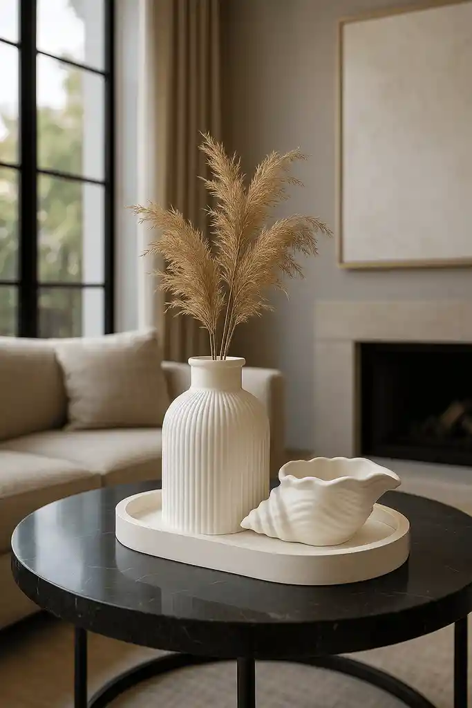 ✨ Estilo Glam / Elegante: Lujo sutil en cada detalle. Nuestros sets de decoración combinan acabados blanco, dorado y plata. Sofisticación para convertir cualquier rincón en una expresión de estilo y elegancia moderna. Decoración que combina un diseño moderno y acabados delicados para llenar tu hogar de estilo, paz y belleza. 🪄 USO / RECOMENDACIONES: ✨ Coloca este set en mesas auxiliares, repisas, estantes flotantes, escritorios o rincones especiales para dar un toque de diseño y armonía. 🕯️ Ideal para complementar con velas, libros decorativos, flores secas o bandejas decorativas. 🏠 Perfecto para salas, estudios, entradas, habitaciones o incluso baños modernos. 📸 También recomendado para sesiones de fotos o ambientaciones en redes sociales. ¡Ideal para regalar o renovar tus ambientes favoritos! 📏 Detalles del producto Incluye: 1 bandeja decorativa + 1 florero + 1 Recipiente forma de caracol Medidas aproximadas: Bandeja: 18 cm ancho Florero:11 cm alto Recipiente caracola: 8 cm ancho Color: Blanco Materiales: Cemento *No incluye flores