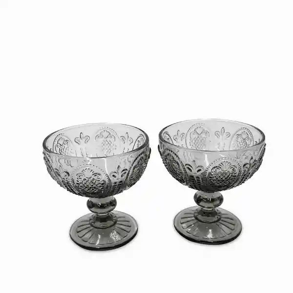 Set Contiene 2 Unidades. Copa de Boca Ancha en Vidrio Transparente Con Textura en Relieve Inspirada en Los Patrones Geométricos y Arabescos de la Cristalería Vintage Con Capacidad Para 280 mL. Es Una Copa Especial Para Presentar Con Creatividad y Buen Gusto Helados y Otros Postres Coloridos. Su Base Ancha le Proporciona la Estabilidad Necesaria Para Soportar el Peso de su Contenido en la Mesa o Sobre Cualquier Superficie.