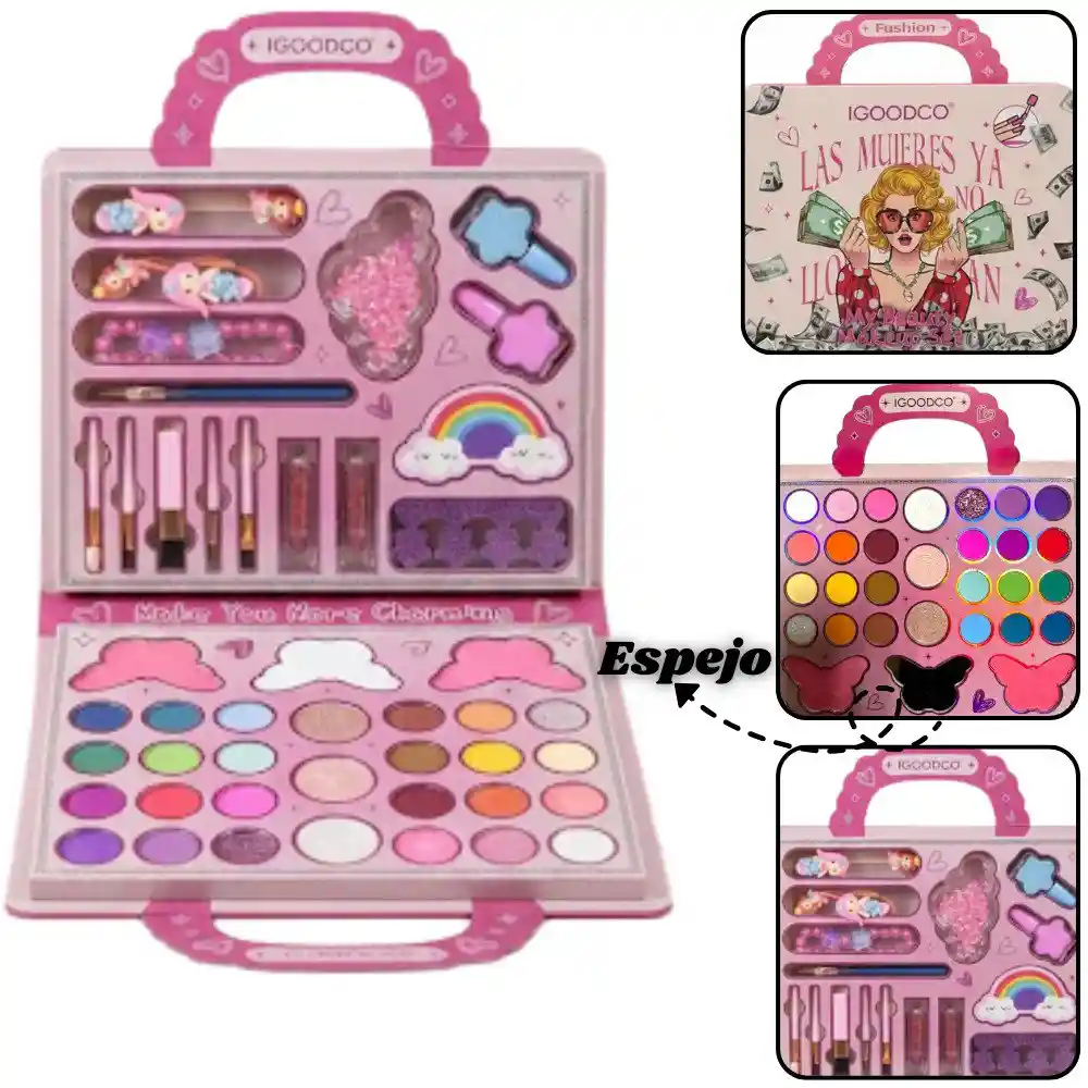 Set de belleza Kit De Maquillaje Infantil X46 Piezas Deja volar la imaginación y creatividad de tu pequeña con el Set de Maquillaje Shining Makeup. Este no es solo un juguete, es una experiencia completa de belleza diseñada especialmente para niñas. Presentado en una hermosa maleta que hará que se sienta como toda una profesional. Al abrirla, se desplegará un mundo de posibilidades: - Bandejas mostrando una increíble variedad de sombras,labiales y un set para decorar sus uñas. Es perfecto para tardes de juego con amigas, fiestas de pijamas o simplemente para divertirse en casa. Características: - Fórmula Segura y Lavable: Este set de maquillaje es suave con la piel delicada de las más pequeñas, y se retira fácilmente con agua y jabón. - Organización Práctica: Cuenta con compartimentos para una mejor organización y un espejo real incorporado en diseño de mariposa, enseñándole a cuidar y ordenar sus tesoros. - Variedad Increíble: Con 46 piezas, ofrece infinitas combinaciones de colores para ojos, labiales, brochas y más. NOTA: * Las imágenes publicadas son de referencia, el producto real puede presentar ligeras variaciones en su tonalidad de color. Contenido de la Caja - 1 Estuche con asa y espejo interior. - Paleta de sombras en polvo - 2 Brillo labial - 2 Esmaltes de uñas (Enviados en colores aleatorios) - Separador de dedos para pedicura. - Lima de uñas - 5 Brochas de maquillaje (Para diferente función). - 1 Lápiz de ojos