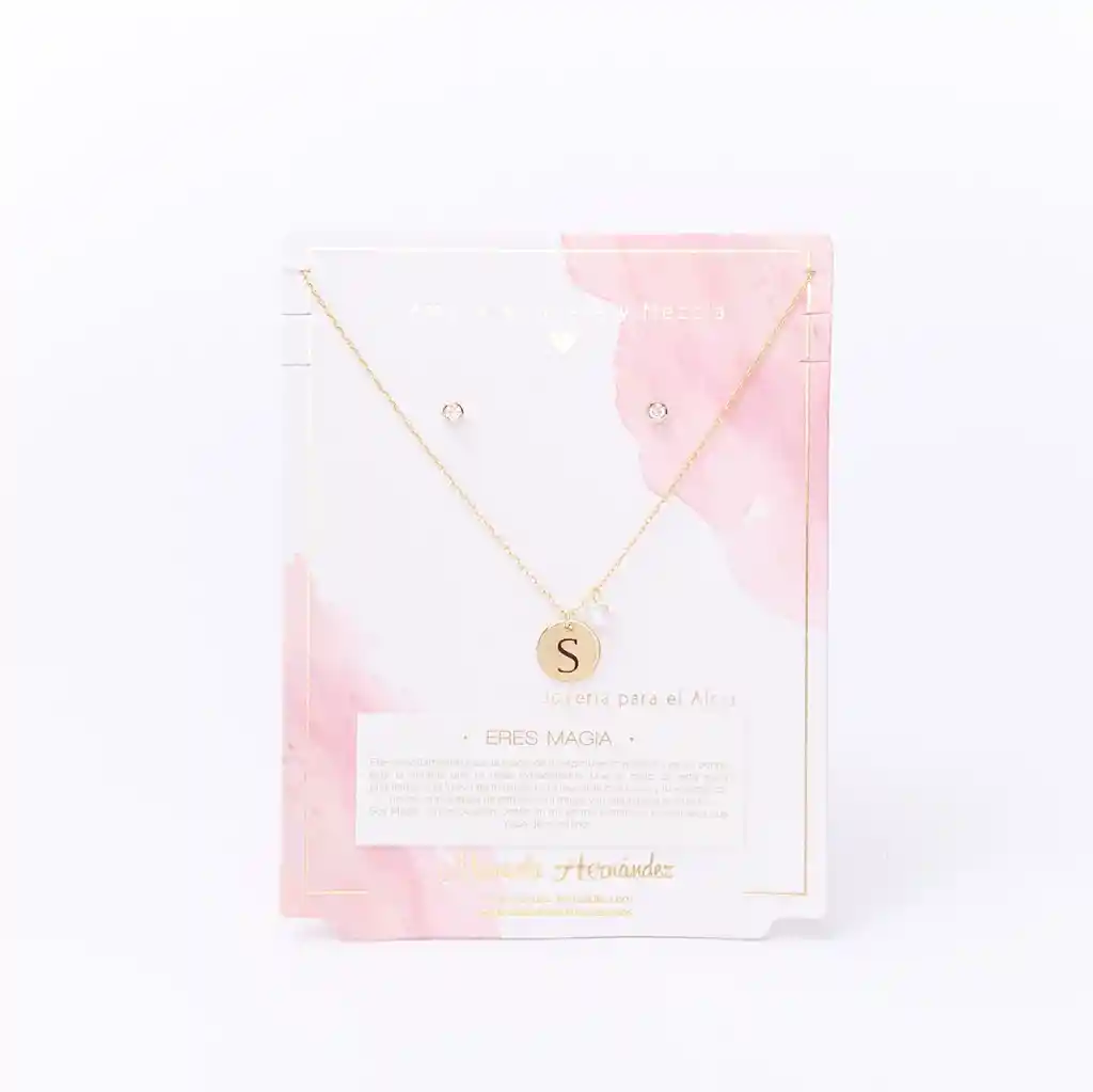 La cadena y los apliques dorados cuentan con Baño de Oro 18k. Elaborado con Cristales Swarovski. Longitud: 45 cm. Incluye Collar y Aretes.