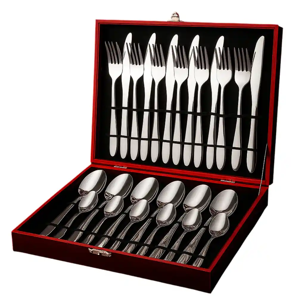 Set de Cubertería con Maletín 24 Piezas – Calidad y Distinción en Cada Detalle Con este set de cubiertos de 24 piezas con maletín, disfrutarás de un equilibrio perfecto entre calidad, diseño y funcionalidad. Hecho en acero inoxidable duradero, garantiza una resistencia excepcional frente al uso continuo, la humedad y el lavado frecuente. Su diseño de líneas suaves y su acabado espejo aportan un toque de sofisticación moderna, mientras los mangos ergonómicos curvos ofrecen una sensación agradable al tacto y un control total durante cada comida. El maletín incluido no solo protege y organiza cada pieza, sino que también lo convierte en una excelente opción para regalo o para quienes buscan mantener sus utensilios bien cuidados. Perfecto para hogares, restaurantes o eventos, este set se adapta a cualquier ambiente y estilo de comedor. Su peso equilibrado y su construcción sólida reflejan un nivel superior de detalle y calidad. Garantía: 30 días por defectos de fábrica. Especificaciones técnicas: Material: Acero inoxidable pulido. Acabado: Brillante tipo espejo. Piezas incluidas: 6 cuchillos, 6 cucharas, 6 cucharitas, 6 tenedores. Presentación: Maletín protector rígido. Diseño: Contemporáneo y ergonómico. Propiedades: Antioxidante, resistente, fácil de limpiar. Recomendado para: Hogares, hoteles, regalos y eventos.