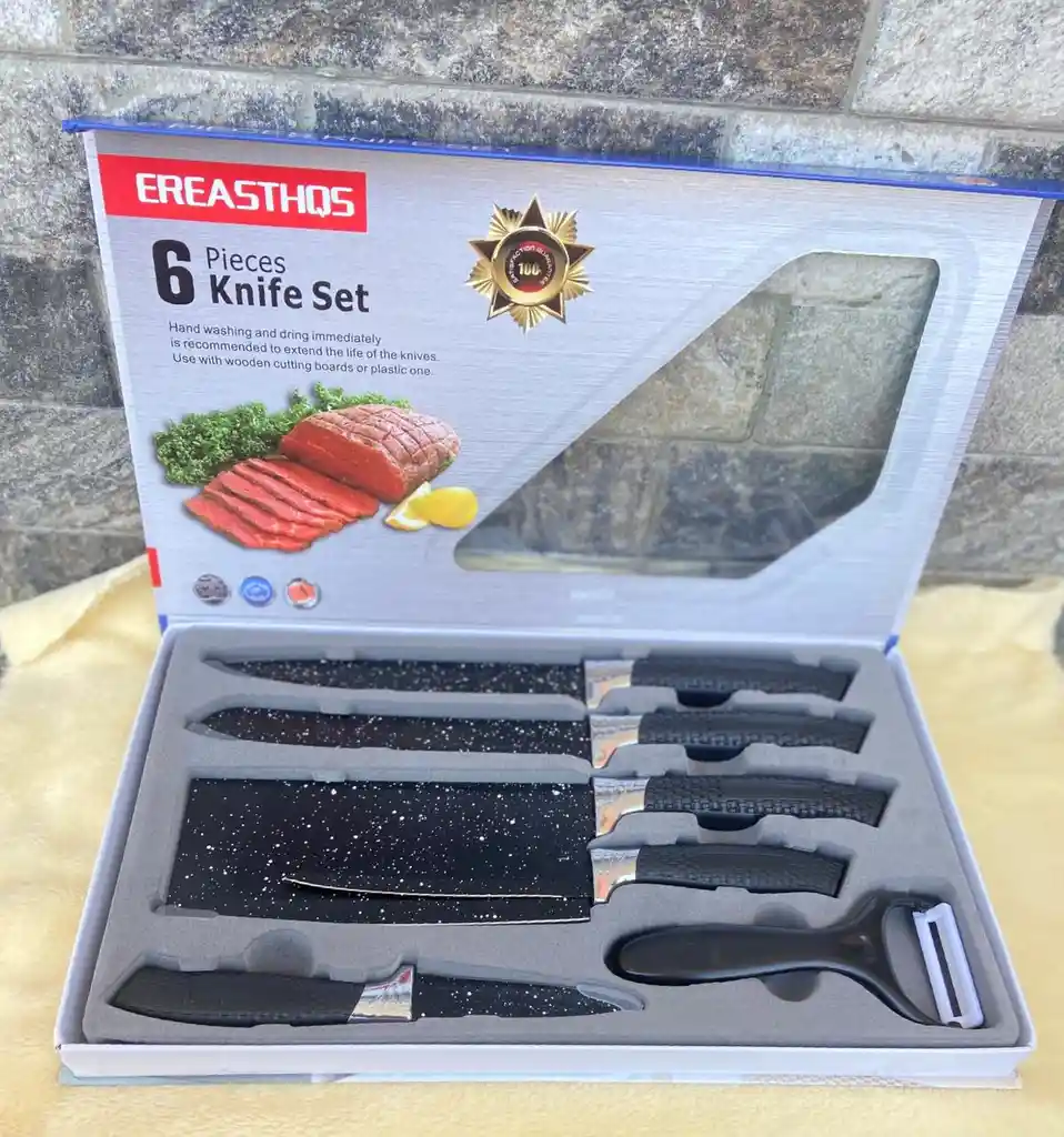 1. Cinco cuchillos de cocina con mangos negros y detalles plateados. 2. Un cuchillo de pelar (peeler) negro con hoja intercambiable. 3. La caja indica que se recomienda lavar a mano y secar inmediatamente para prolongar la vida útil de las cuchillas. 4. También sugiere usar tablas de cortar de madera o plástico.