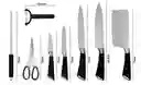 Juego Cuchillos Acero Inoxidable x 8 piezas + base Hojas gruesas y duraderas Mango duradero y hergonométrico con terminación mate fácil de limpiar Hojas en Acero Inoxidable resistente a manchas y a la corrosión incluye herramienta de afilado y tijeras para cocina. •Fabricados en acero al calor brindan mejor corte. Incluye 5 cuchillos Mango ergonómico de seguridad fabricado en carbonato. (no se desliza) Práctica base organizadora Lo que obtienes con tu compra 5 x Cuchillos 1 x Afilador 1 x Tijeras 1 x Revanador 1 x Base Giratoria