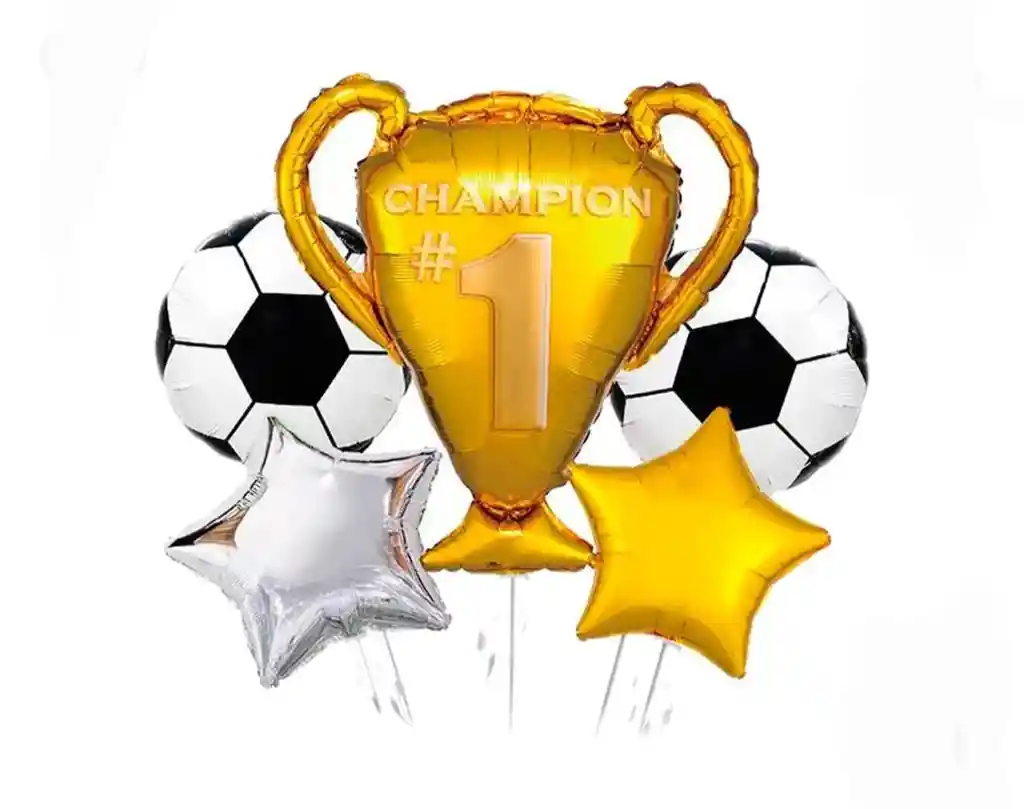 2 globos metalizado fùtbol de 18 pulgadas, 1 globo estrella plateada 18 pulgadas, 1 globo estrella dorada 18 pulgadas, 1 globo metalizado copa 62 x 58 cms