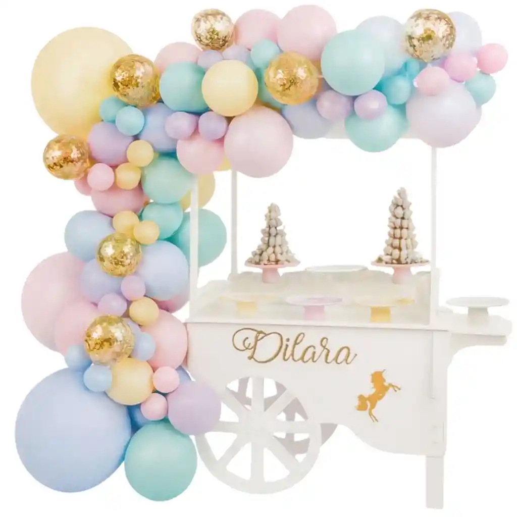 🎉 Kit de Globos Dingsheng - 100 piezas para Arco Decorativo Este paquete incluye una selección encantadora de globos en tonos pastel y dorados, ideal para crear un arco festivo con estilo elegante y alegre. Los tamaños y colores están pensados para dar volumen, textura y brillo a tu decoración: Tamaño Color / Tipo Cantidad 18 pulgadas Morado pastel (1) 18 pulgadas Rosa pastel (1) 18 pulgadas Dorado metálico (1) 12 pulgadas Dorado con confeti (7) 10 pulgadas Morado pastel (20) 10 pulgadas Dorado metálico (8) 10 pulgadas Rosa pastel (15) 5 pulgadas Azul pastel (20) 5 pulgadas Dorado metálico (10) 5 pulgadas Rosa pastel (15) Accesorios Cinta decorativa (1) Accesorios Tira adhesiva para arco (1)