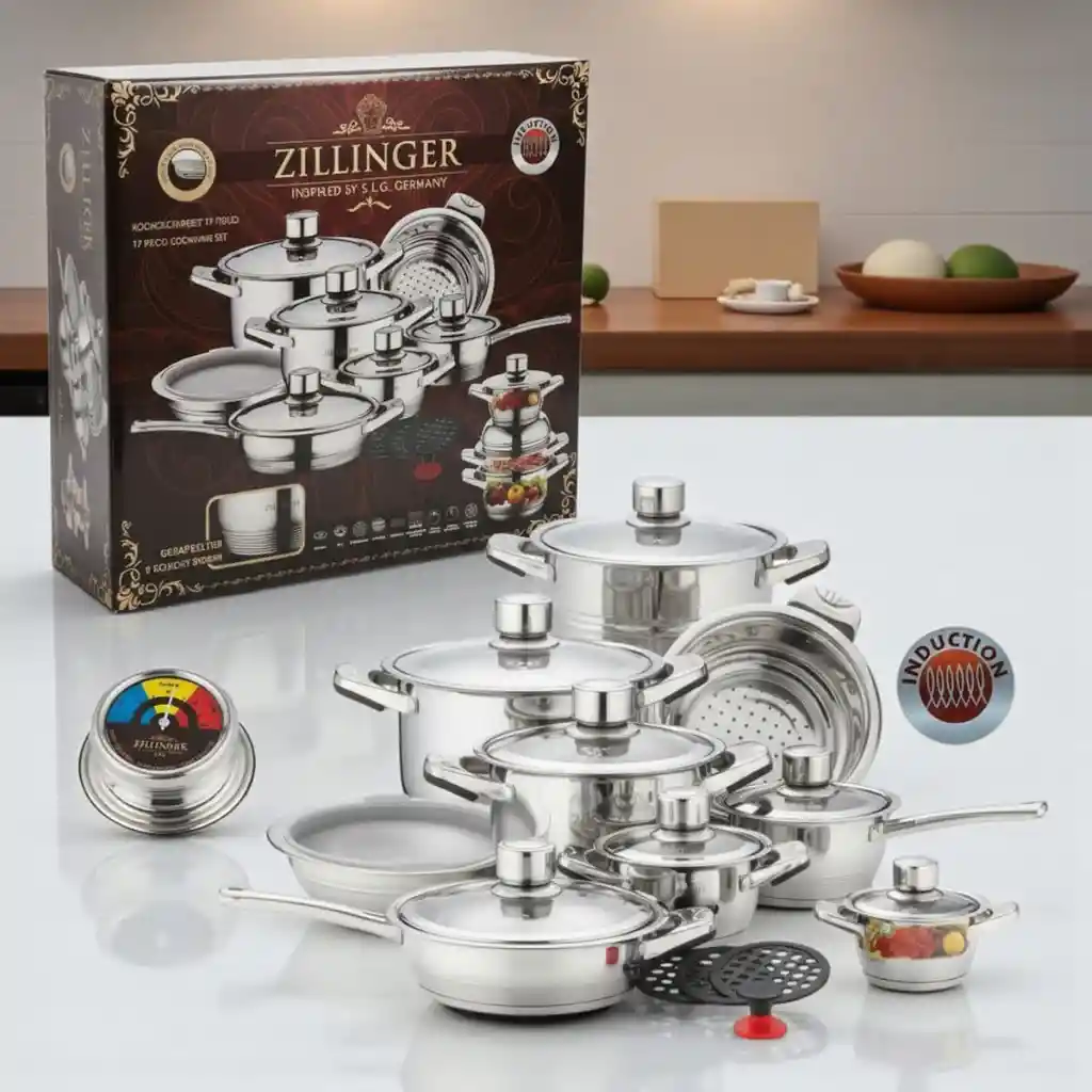 La batería de cocina de ZILLINGER es sinónimo de preparación de alimentos rápida, fácil y saludable. ¡Resultados de cocina y limpieza fáciles! ZILLINGER es un fabricante confiable de alta calidad desde hace años. La batería de cocina ZILLINGER se fabrica en una sola fábrica. Creemos que prestamos especial atención a cada olla y sartén. que solo existe una batería de cocina hecha a mano, por lo que la batería de cocina de la marca ZILLINGER le ofrece una cocina cómoda. Este sistema único de 9 capas garantiza una vida útil muy larga. La combinación de las diferentes capas metálicas, que contienen aluminio, garantiza una distribución del calor uniforme y rápida. Las 9 capas se combinan de la siguiente manera: 1. Acero inoxidable 304 2. Acero C 3. Acero inoxidable 304 4. Revestimiento de aluminio 5. 100% aluminio 6. Revestimiento de aluminio 7. 100% aluminio 8. Acero C 9. AISI 430 Acero inoxidable para hornos de inducción Este horno Zillinger puede utilizarse en hornos de gas, electrocerámica, halógena e inductivamente