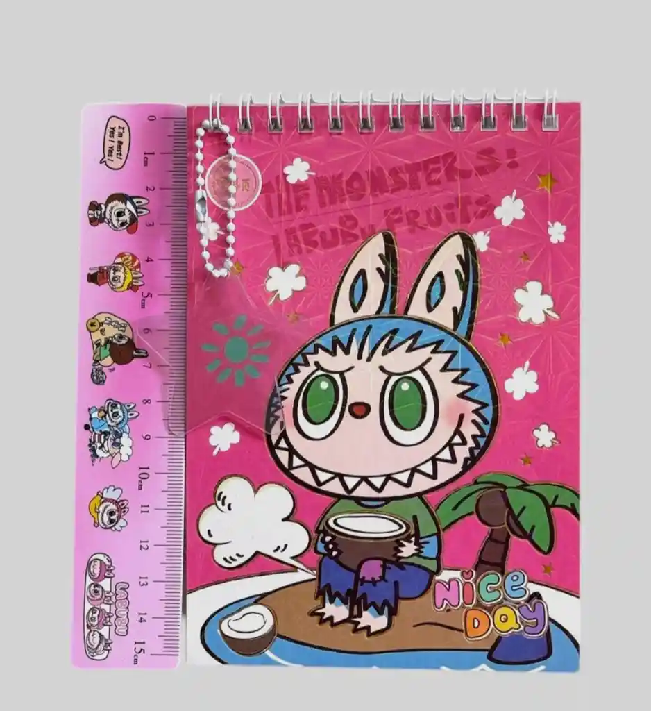 Un cuaderno kawaii de Labubu con diseño colorido y divertido, perfecto para tus notas, apuntes o dibujos. Este set incluye: ✔️ 1 cuaderno en espiral con portada de Labubu. ✔️ 1 regla ilustrada con personajes adorables. ✔️ 1 llavero decorativo a juego.
