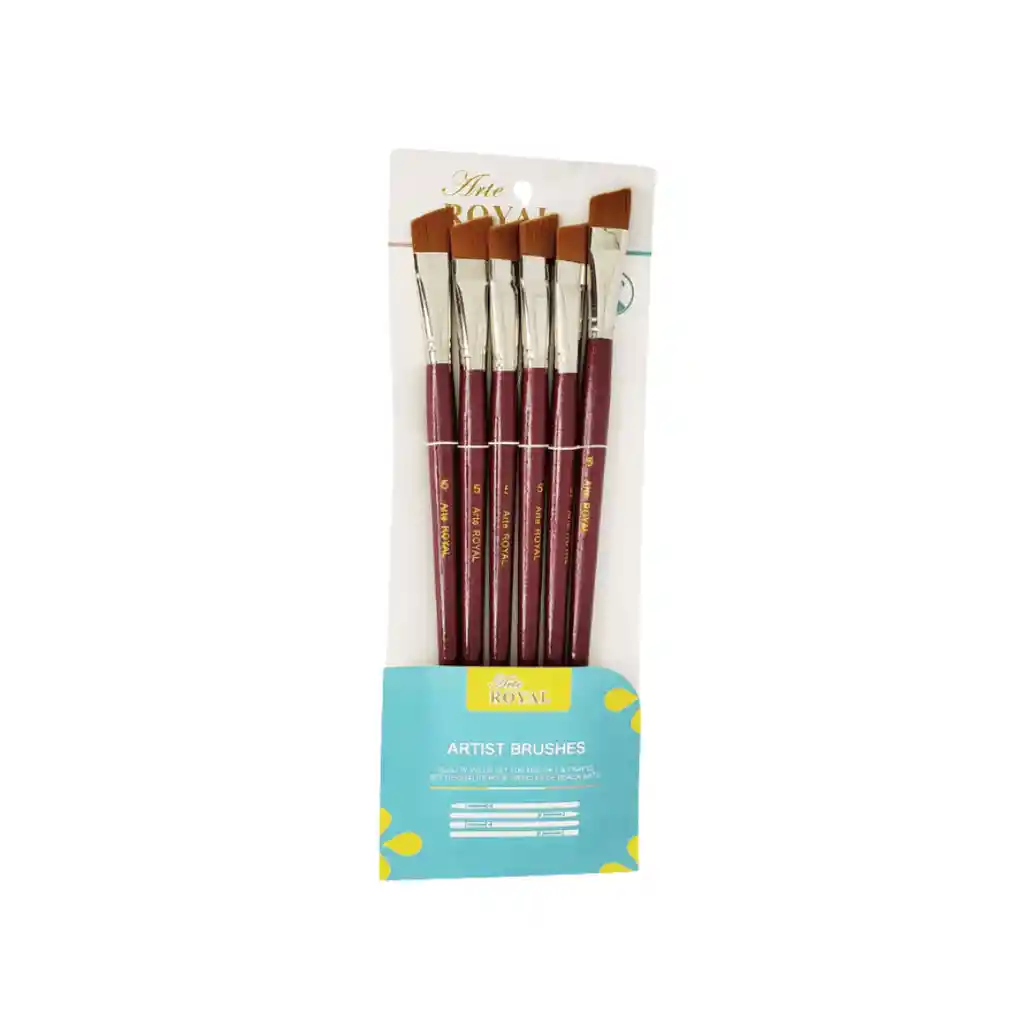 Set de 5 pinceles angulares GO-1057 con cerdas sintéticas y mangos de madera. Ideales para trazos precisos y efectos de sombreado en pintura.